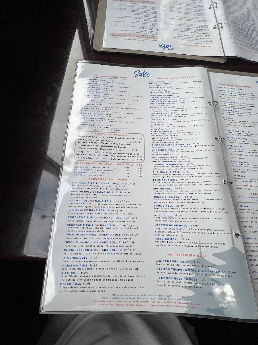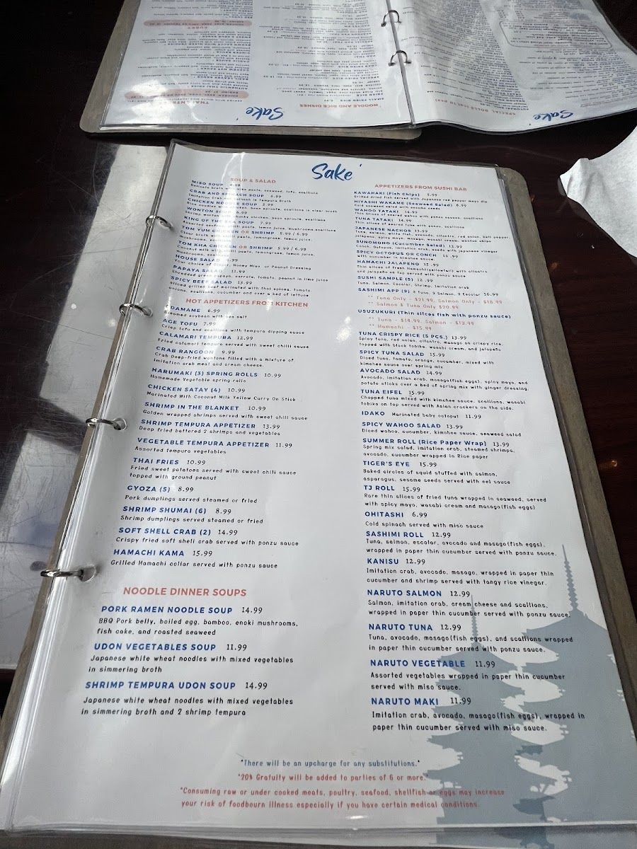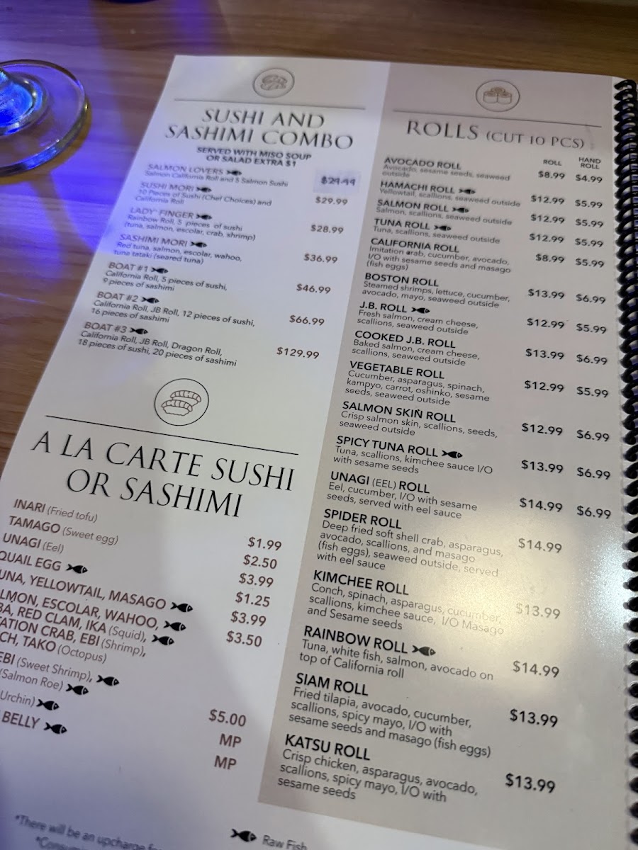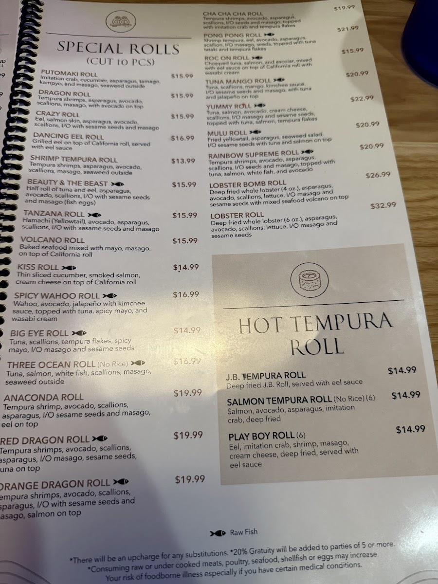 Rare thin slices of fried tuna wrapped in seaweed, served with spicy mayo, spicy cream wasabi and masago